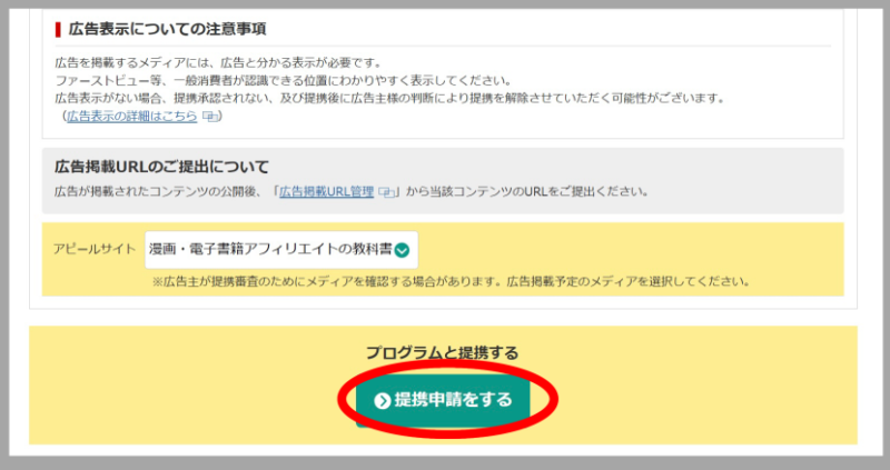 「提携申請」とは、広告を出している企業(広告主)に、「このブログに貴社の広告を貼りたいんだけど」と伺いをたてること。