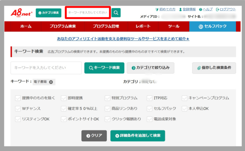 ASPで広告を探すには、各ASPの検索バー(虫眼鏡)に、