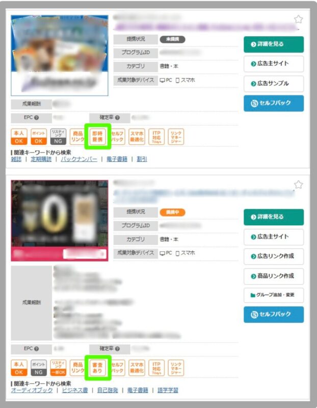 「即時提携」と明記されている広告は、審査がないので申請後すぐに承認されます。