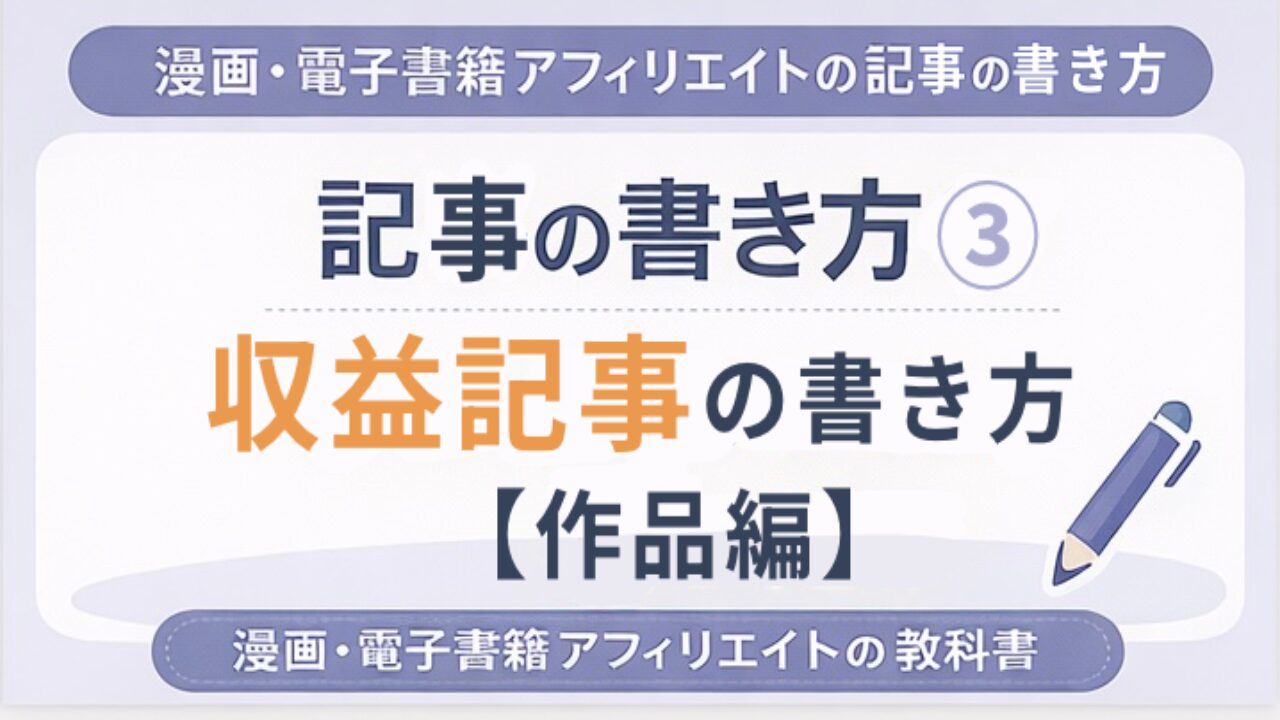 前回の記事↓ 漫画・電子書籍アフィリエイトの記事の書き方③収益記事の書き方【作品編】   からの続き。 前回までの記事では、「漫画作品」についての集客記事と収益記事について解説しました。 「漫画作品」 ...